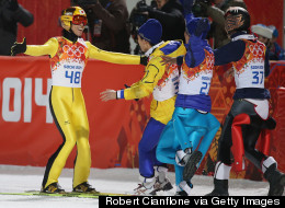 SOCHI, RUSSIA - FEBRUARY 15: Gold medlaist Kamil Stoch of Poland is lifted on the shoulders of Maciej Kot of Poland and Jan Ziobro of Poland after the Men's Large Hill Individual Final Round on day 8 of the Sochi 2014 Winter Olympics at the RusSki Gorki Ski Jumping Center on February 15, 2014 in Sochi, Russia. (Photo by Alexander Hassenstein/Getty Images)