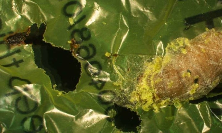 ベルトッチーニ氏は、蜜蝋を食べて蜂の巣に害を与えるワックスワームを蜂の巣から取り除き、プラスチック製のレジ袋に入れておいた。しばらく後で見てみると、袋は穴だらけになっていた。