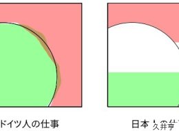 しばらくフランクフルトで働いてみて、なんとなくドイツ人と日本人の仕事のやり方の違いがつかめてきたような気がするので絵に描いてみた。一言で言うとドイツ人の仕事は雑だ。でも、まわりの人はそれを補ったりあるいは受け入れたりする。決してモラルが低いわけではないけど、ただ自分がいい加減な分他人にもそこまで求めないし、困ったら助け合えばいいと普通に思っている。