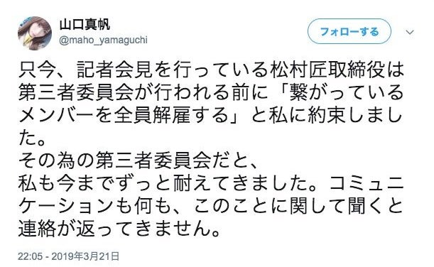 会見をリアルタイムで視聴しているとみられる山口さんは、ツイートを更新し、「只今、記者会見を行っている松村匠取締役は第三者委員会が行われる前に『繋がっているメンバーを全員解雇する』と私に約束しました」と訴えた。