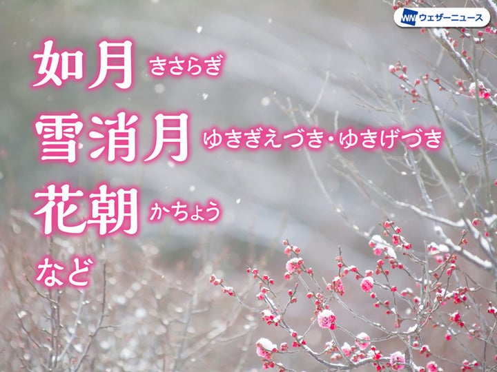 「梅見月(うめみづき)」をはじめ、「梅の花見月(うめのはなみづき)」「梅津月(うめつづき)」「梅津早月(うめつさづき)」など、梅にちなむ月名も多く見られます。