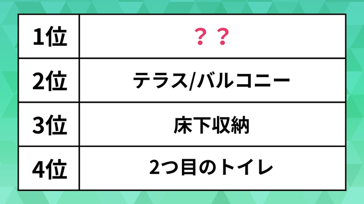 第3位は床下収納。床下収納は収納スペースが増えるだけでなく、普段使用しないものを入れておく場所として便利だという声が集まりました。