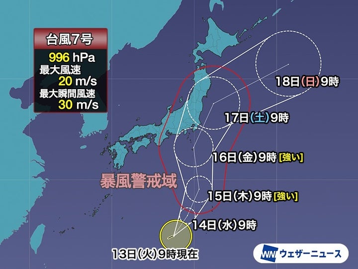 台風7号は今後発達しながら日本の南を北東に進み、明日14日(水)夕方から夜にかけて小笠原諸島に最も接近する見込みです。その後は強い勢力となって北に向きを変え、お盆期間終盤となる16日(金)から17日(土)にかけて暴風域を伴って関東など東日本に接近するおそれがあります。その後はやや東寄りに進路を変えますが、北日本方面にも影響を及ぼす可能性があります。