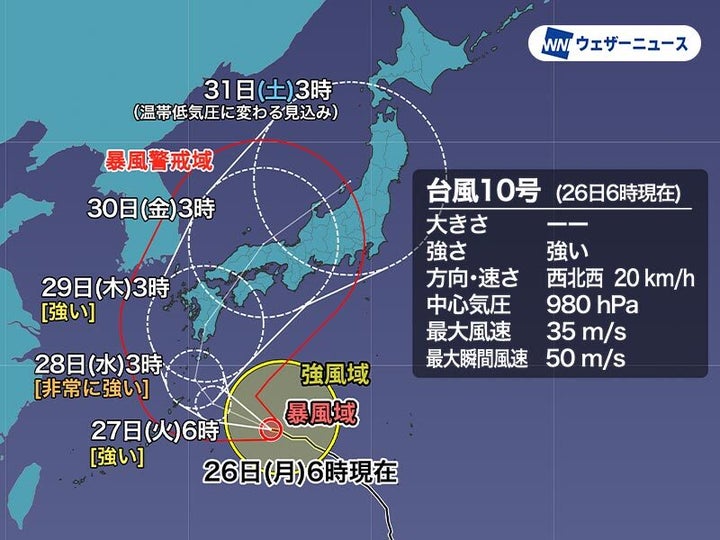 進路に近い地域では暴風の影響が大きくなることが懸念され、瞬間的に40〜50m/sの猛烈な暴風が吹き荒れるおそれがあります。日本列島通過時の台風の移動速度が遅いため、停電や物流への影響などが数日にわたり継続するおそれがあります。今のうちに備えをお願いします。また、進路の東側に離れた地域でも風が強まり荒天となるおそれがあるため注意が必要です。