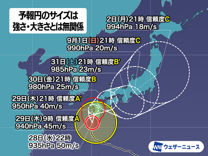 予報円が小さいほど進路の予報の信頼度が高く、予報円が大きいほど予報の信頼度が低いことになります。