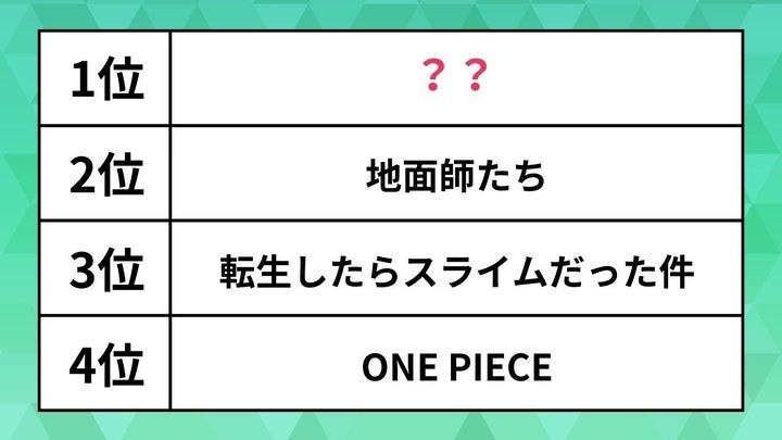 3位は、「転生したらスライムだった件」です。強大な力を持ったスライムとして異世界に生まれ変わった主人公・リムル=テンペストが、魔王国を建国し、理念に沿って突き進んでいく物語です。