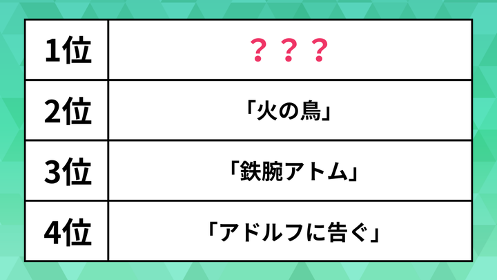 「火の鳥」と回答した人からは「テーマが歴史、未来、戦争、輪廻転生などとても深い。深いのにそのあたりの知識がなくても頭にすっと入ってきて物語に集中できる」「手塚治虫の独特な世界観と深いテーマ性が堪能できるからです」などのコメントが寄せられました。