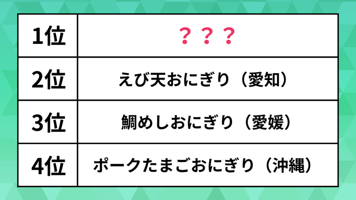 2位は愛知県の「えび天おにぎり」。えびの天ぷらが入ったこのおにぎりは「天むす」と呼ばれる、名古屋のソウルフード的存在です。小さめなサイズと甘いタレが染み込んだご飯が特徴です。