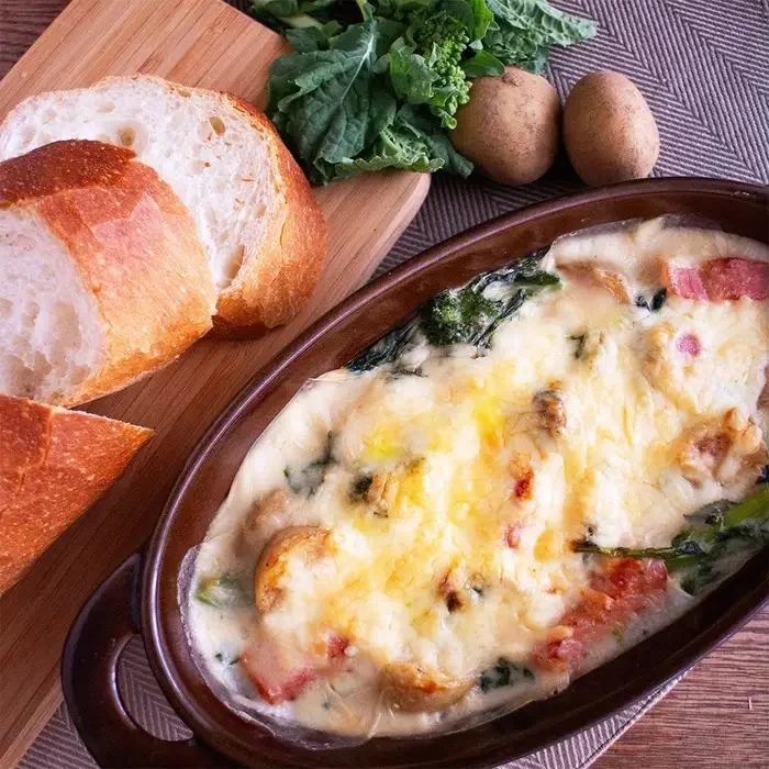 旬の菜の花と新じゃがいもを主役にした春色グラタン。ベーコンの旨味がコクをプラスし、濃厚なホワイトソースが素材の味を引き立てます。春の食卓にぴったりの一品です♪