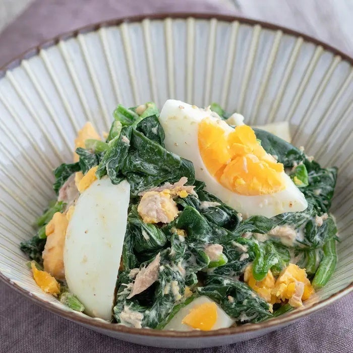 シンプルなのに箸が止まらない!「ほうれん草とゆで卵のツナマヨ和え」のレシピをご紹介します♪ 栄養たっぷりのほうれん草に、まろやかなゆで卵を合わせてコクうまなツナマヨソースで和えるだけ!あと一品欲しいときに大活躍の簡単レシピです。