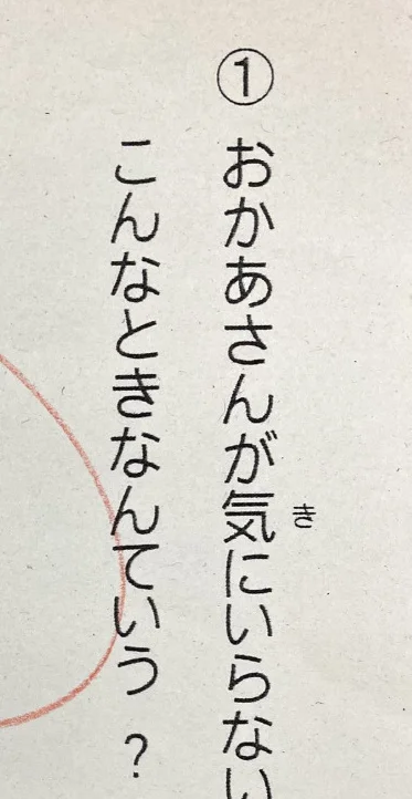 プリントは「お母さんが気にいらない服を買ってきた。なんていう?」という質問に「きるよ」と、大きく書かれています。
