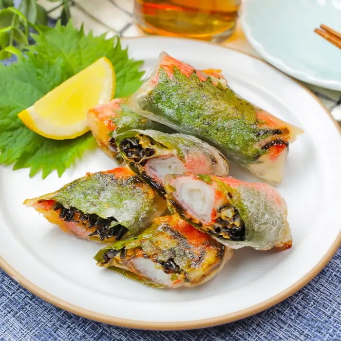 「カニカマ」で簡単な激ウマおつまみレシピ!カニカマ、チーズ、大葉、塩昆布を「ライスペーパー」で包んで焼けば、カリッとモチモチ!チーズを入れても中からあふれず、カニカマと塩昆布の旨味が口の中で広がります。大葉の爽やかな香りが一度食べたらクセになる!ライスペーパーの消費にもぴったりです。