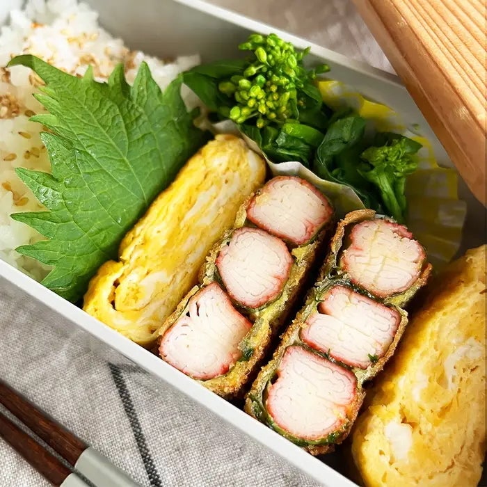お弁当にぴったりの「カニ風味かまぼこと大葉のパン粉焼き」をご紹介!カリッと香ばしい衣に包まれたジューシーなカニ風味かまぼこと、大葉の爽やかな香りが相性抜群♪冷めてもおいしく、彩りも良いのでお弁当の主役になること間違いなしです!