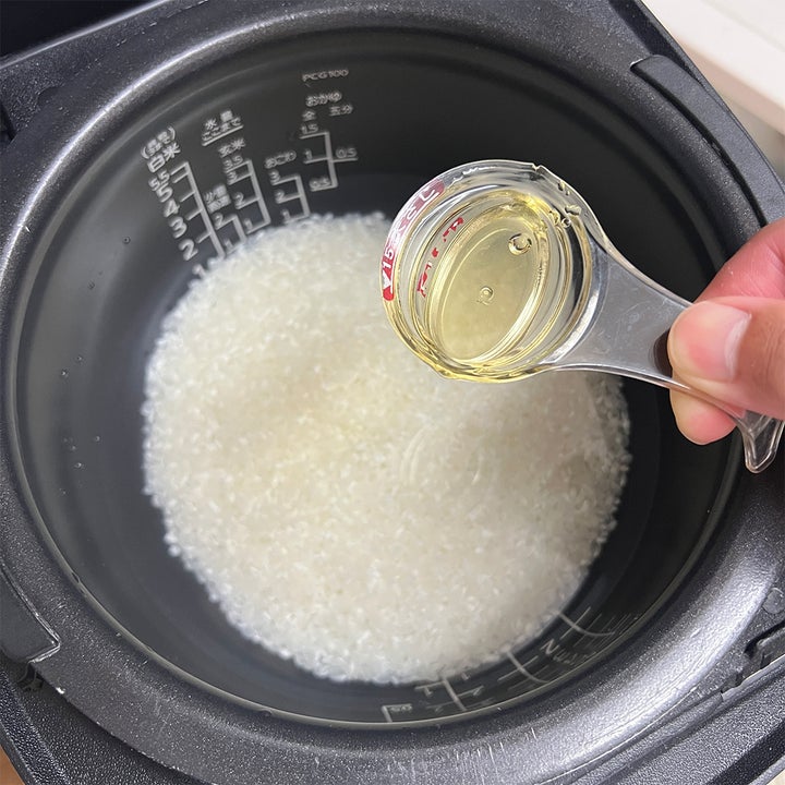 お米を研いで水を入れたら、みりんを加えて、あとはいつも通り炊くだけです!