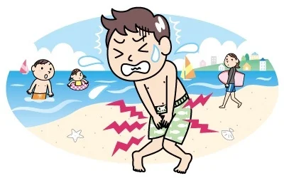 男児の海水パンツを母親が下ろすと、 男児が「痛い、痛い」と言った。見ると、インナーのメッシュ生地に陰茎部の皮膚が挟まれ、陰茎から出血していた。陰茎挫創となった。