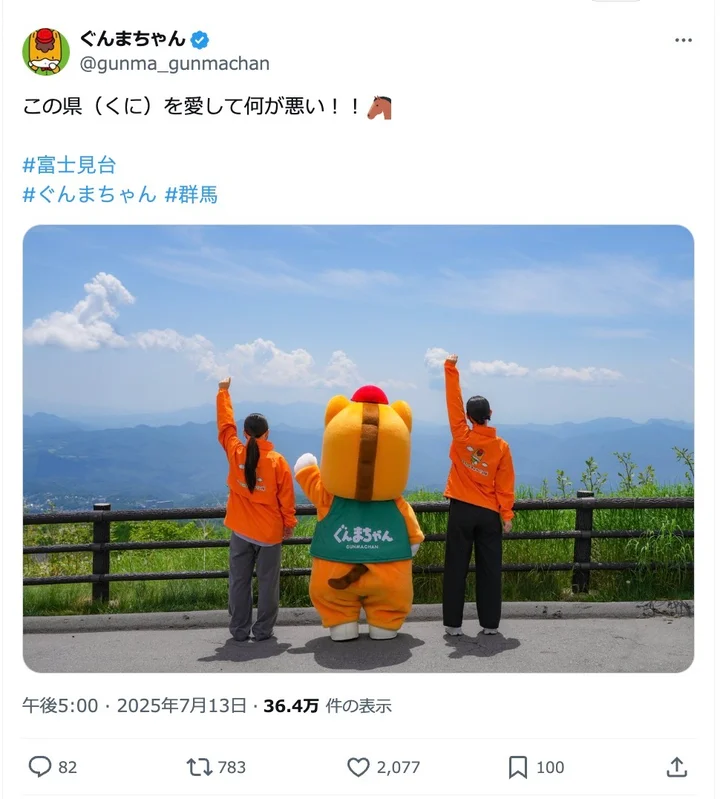 7月13日17時に投稿いたしましたぐんまちゃんXでのポストについて、ご説明を申し上げます。選挙期間中であるにもかかわらず、一部の方に特定の政党を支持しているかのような誤解を招く表現となってしまいました。配慮が足りず、誠に申し訳ございません。— ぐんまちゃん公式情報 (@gunmachan_info) July 13, 2025当該の投稿は、政治的な意図を持って発信したものでは一切ございません。また、スタッフの登場につきましても、演出の一部であり、スタッフ着用のオレンジ色のパーカーは、10年以上前からぐんまちゃんキャラバン隊の制服として使用しており、今回の投稿のために新たに用意したものではありません。— ぐんまちゃん公式情報 (@gunmachan_info) July 13, 2025Advertisement 今後は、より一層の配慮をもって発信に努めてまいります。— ぐんまちゃん公式情報 (@gunmachan_info) July 13, 2025【記事全文はこちら】ぐんまちゃん「排外主義」と批判された投稿を削除。「誤解を招く表現となってしまった」
