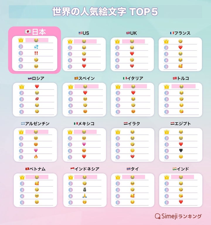 7月17日に制定されている「世界絵文字デー」にあわせて、対象の16か国で頻繁に使用されている絵文字を調査し、ランキング形式で結果を公開。