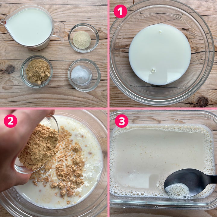 ① 耐熱ボウルに半量の牛乳を入れ、ラップをかけずに600Wの電子レンジで1分加熱する。