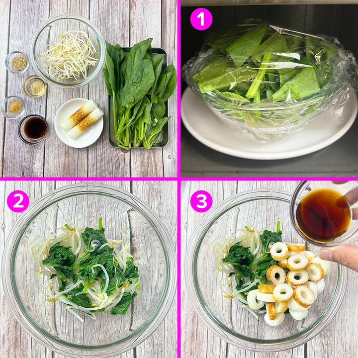 ① よく洗って食べやすい大きさに切ったほうれん草と、もやしを耐熱ボウルに入れてラップをかけ、600Wの電子レンジで2分加熱する。