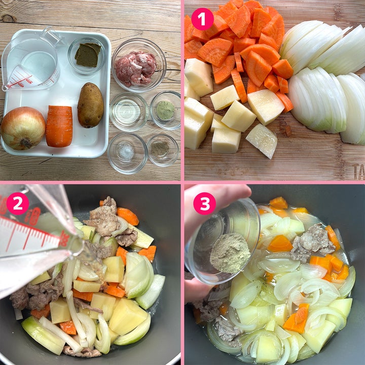 ③ ②に水を注ぎ、弱火にして15分程煮込む。火を止め、昆布茶を加えてひと混ぜする。カレールウを加えてよく溶かしたら、完成!