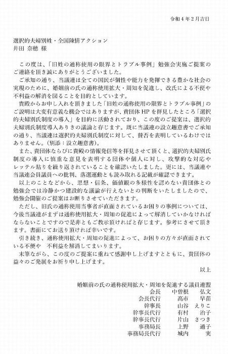 2021年12月、私たちは主要8党を巡回した「旧姓の通称使用の限界とトラブル事例」勉強会を、高市氏が代表代行を務める「婚姻前の氏の通称使用拡大・周知を促進する議連連盟」でも開催してもらえるよう申し入れました。「女性活躍のために旧姓使用の推進を」という議連の主張が本当なら、当事者の意見には耳を傾けるはずです。