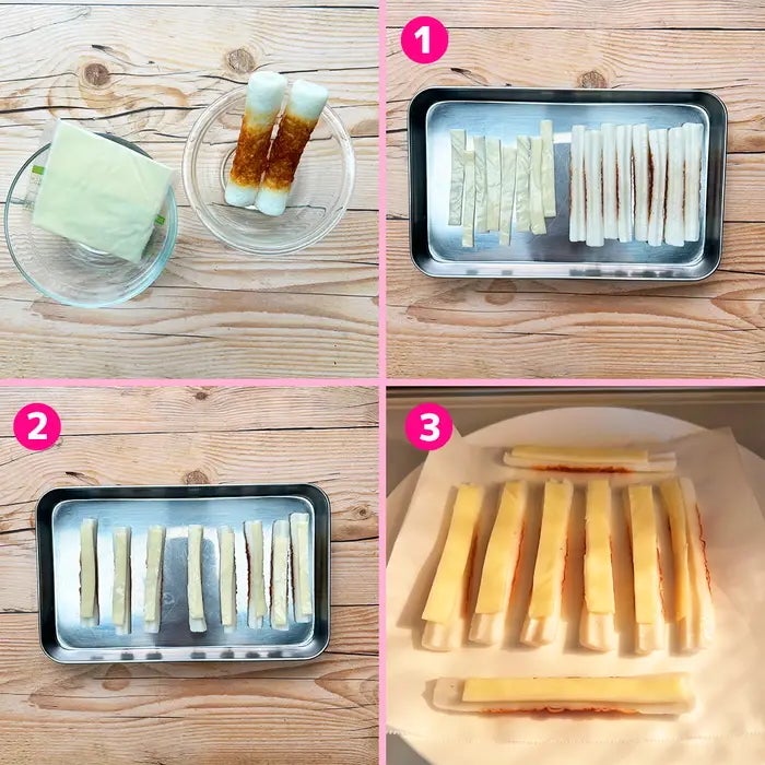 ③ 耐熱皿にクッキングシートを敷き、②を重ならないようにのせる。600Wの電子レンジで2分加熱したら、完成!