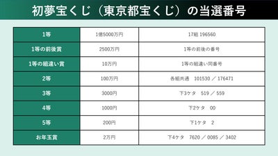 初夢宝くじ当選番号。2025年の抽選結果(東京都、関東・中部・東北、近畿、西日本)