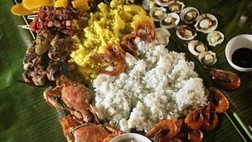 「ブードル・ファイト」とはフィリピンの伝統的な軍隊式の食べ方で、上下関係なく同じ席に座りプレートの代わりにバナナの皮の上に料理を載せてたべる...といったもの。