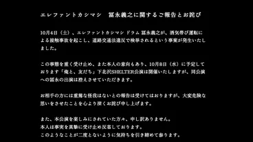 ロックバンド「エレファントカシマシ」のドラマー冨永義之さんが道路交通法違反で検挙されたとして所属事務所が「謝罪文」を公表しました。