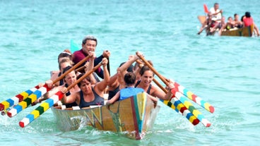 米軍普天間飛行場(沖縄県宜野湾市)の移設工事が進む名護市辺野古で4日、伝統のボート競争「辺野古ハーリー」があった。