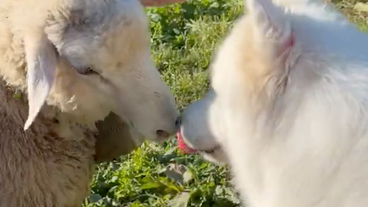 北海道のファームを訪れたサモエド・スキーくんとサモエド×ハスキーのパウくんは、体格も毛並みも自分達とそっくりの羊に出会いました。