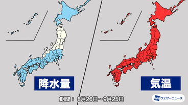 西日本や東日本は8月の後半から9月も暖かな空気が流れ込みやすく、残暑が続く見込みです。北日本は天気が周期的に変化し、気温は平年並みに近くなる予想となっています。