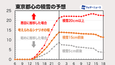ウェザーニュース独自予報では、東京23区では昼頃から雪が降り始め、特に夕方から夜に雪の降り方が強まり大雪となって、都心でも15cm前後の積雪になると見込んでいます。